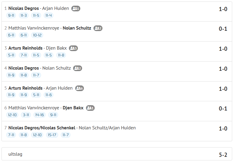 Arturs Reinholds en Nicolas Degros bleven in de ruim vier uur durende wedstrijd ongeslagen. Het afsluitende dubbelspel Degros/Schenkel tegen Schultz/Huiden leverde in de vijfde game het vijfde punt op.