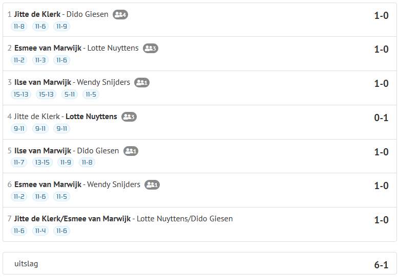 De ReynDesign/Westa dames leden zondagmiddag in Leiden met 1-6 tegen Scylla een zware nederlaag. Alleen Lotte Nuyttens smaakte het zoet van een overwinning tegen Jitte de Klerk.