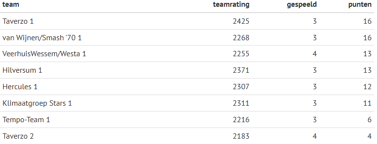 Zaterdagmiddag leden de VeerhuisWessem/Westa heren in Nieuwegein een nederlaag met maximale cijfers tegen kampioenskandidaat Taverzo 1. Een belangrijke zege werd door de Wessemse heren zondagmiddag geboekt in de thuiswedstrijd tegen Taverzo 2. Team VeerhuisWessem/Westa was de tegenstander met een 5-2 overwinning ruim de baas.