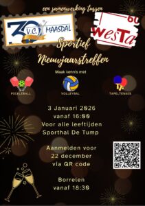 Het jubileumjaar 2025 is voorbij gevlogen en 2026 staat alweer bijna voor de deur. Net zoals het afgelopen jaar organiseren we op zaterdag 3 januari samen met VC Maasdal een gezellig sportief nieuwjaar treffen.