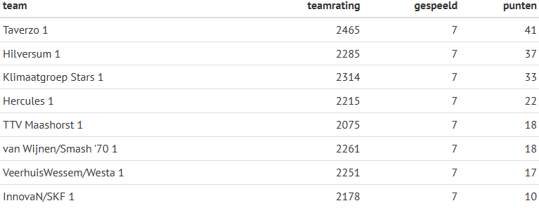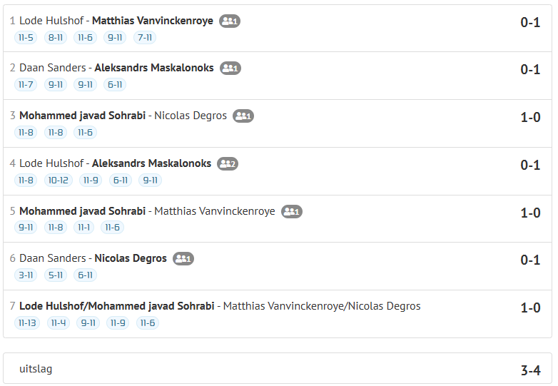 De VeerhuisWessem/Westa heren 1 wonnen zondagmiddag de laatste eredivisie uitwedstrijd in Terborg tegen Hercules 1 met 3-4. Aleksandrs Maskalonos bleef ongeslagen. Nicolas Degros leed zijn eerste nederlaag van het seizoen. Door winst in het afsluitende dubbelspel hadden de Wessemse heren met de vijfde plaats de beste uitgangspositie in de play downs kunnen bewerkstellen. Dat voordeel ging in de beslissende vijfde game echter alsnog verloren.