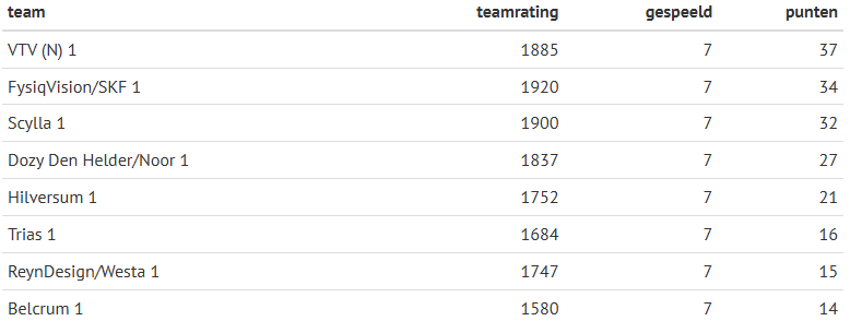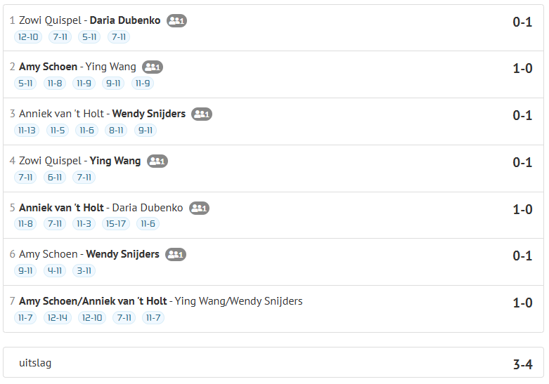 De ReynDesign Westa dames 1 wisten zondagmiddag in Breda de laatste uitwedstrijd van het seizoen met 3-4 te winnen van Belcrum 1. Daardoor eindigen de Wessemse dames op de voorlaatste plaats in de reguliere competitie en spelen ze in de halve finale play down op 22 november in een uitwedstrijd in Twello tegen de dames van Trias 1. Wendy Snijders bleef deze middag ongeslagen tegen Anniek van ’t Holt en Amy Schoen. Daria Dubenka en Ying Wang pakten beiden een punt tegen Zowi Quispel.
