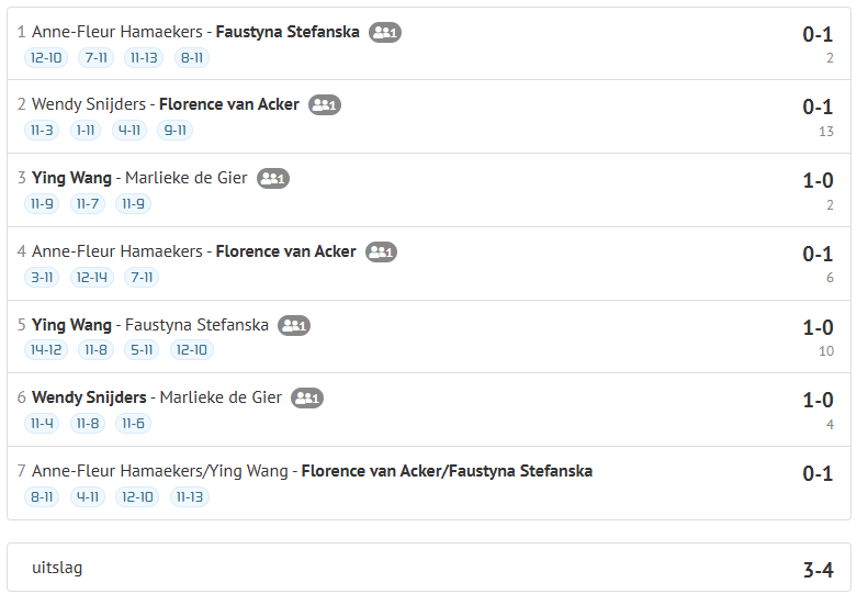 De ReynDesign/Westa dames kenden een mindere start door twee verliespunten in de eerste twee wedstrijden. Ying Wang zorgde voor de ommekeer door winst tegen de Giere en Stefanska. Door de winst van Wendy Snijders tegen Marlieke de Gier ontstonden er zo waar winstkansen voor het Wessemse team. Echter Anne-Fleur Hamaekers en Ying Wang konden in het afsluitende dubbelspel het karwei niet afmaken tegen het duo van Acker/Stefanska.
