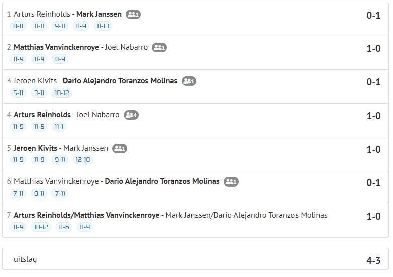 Zondagmiddag werd een dubbel eredivisie programma gespeeld in Wessem. De VeerhuisWessem/Westa heren boekten de tweede overwinning van het seizoen op rij. Met veel moeite werd met 4-3 gewonnen van promovendus Tempo Team uit Amsterdam. Uit de kunst was de knappe overwinning van Jeroen Kivits tegen Mark Janssen die in de openingswedstrijd verrassend in vijf games wist te winnen van Arturs Reinholds.