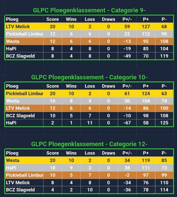 Met nog twee ontmoetingen te gaan is Westa PB in de 12- categorie nog steeds in de race om het overall klassement van de GLPC te winnen. Opvallend is de gedeelde tweede plaats van team Westa PB 2 in de 9- categorie. Team 3 staat heel verdienstelijk derde in het tussenklassement.